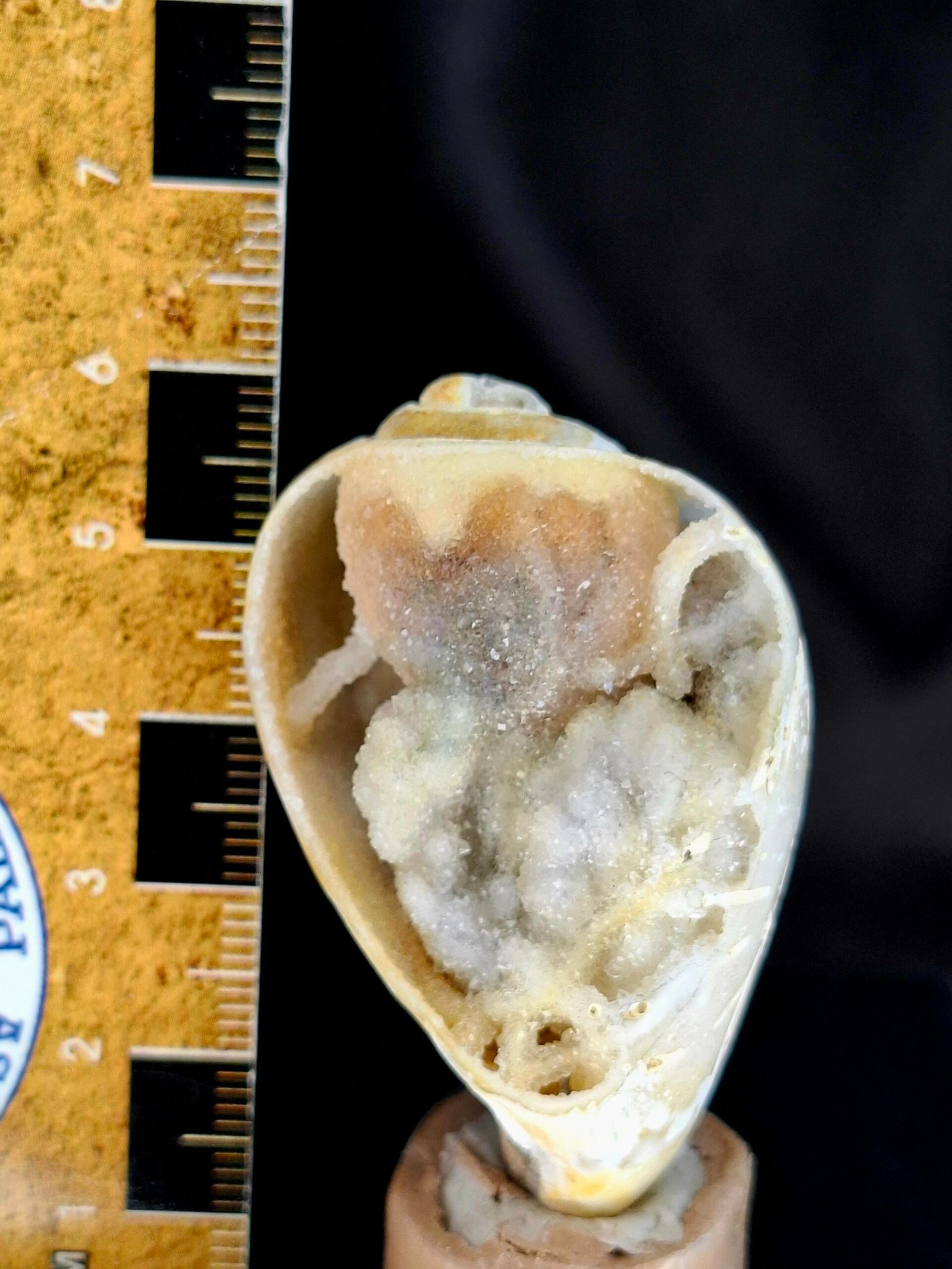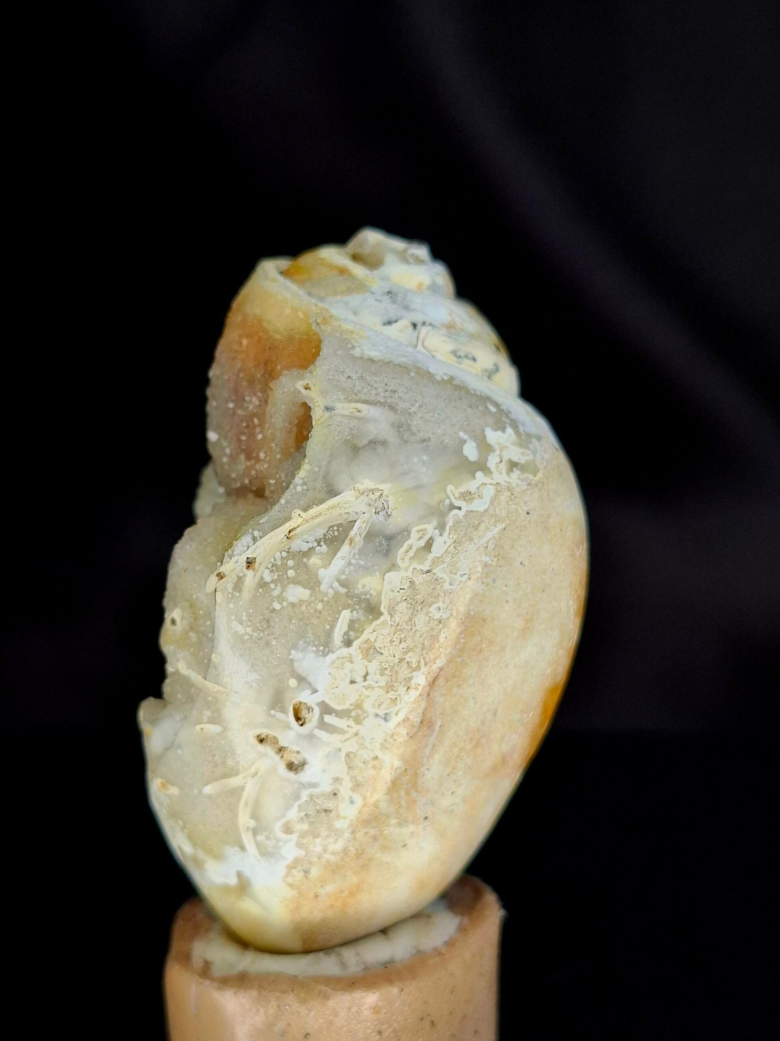 The shell has undergone a remarkable fossilization process known as Agatization. Over millions of years, the original shell material was replaced by microcrystalline quartz or agate, transforming the fossil into a natural geode. The exterior of the shell displays rich, warm brown and orange tones. A natural break reveals a stunning interior, which is lined with sparkling crystals that exhibit a subtle white and purplish-blue hue.