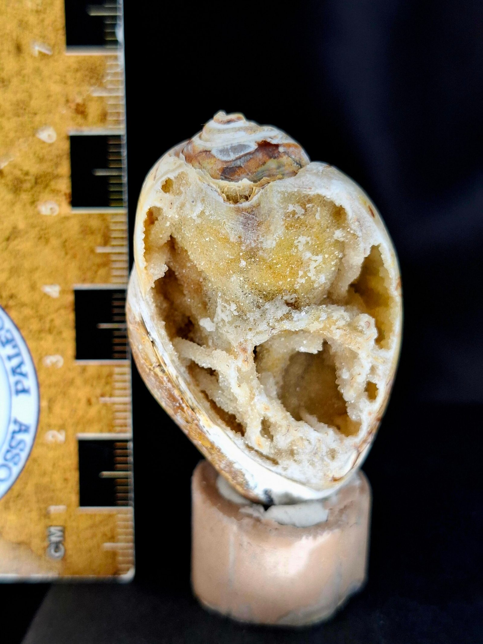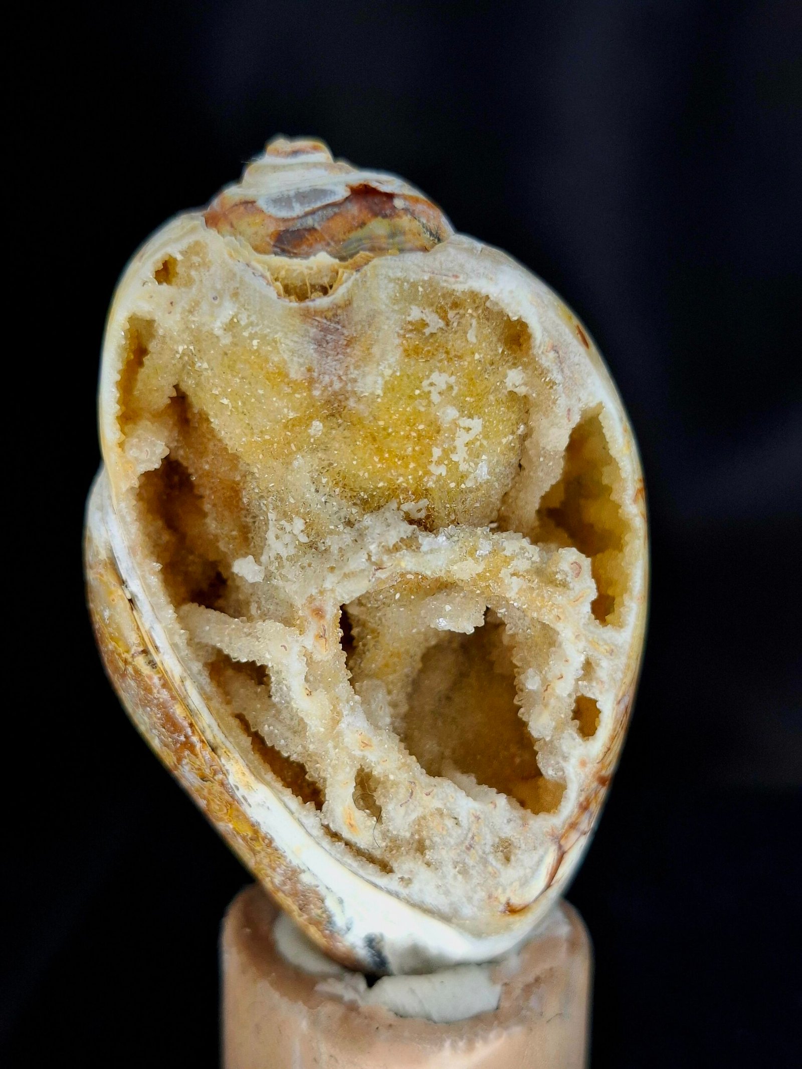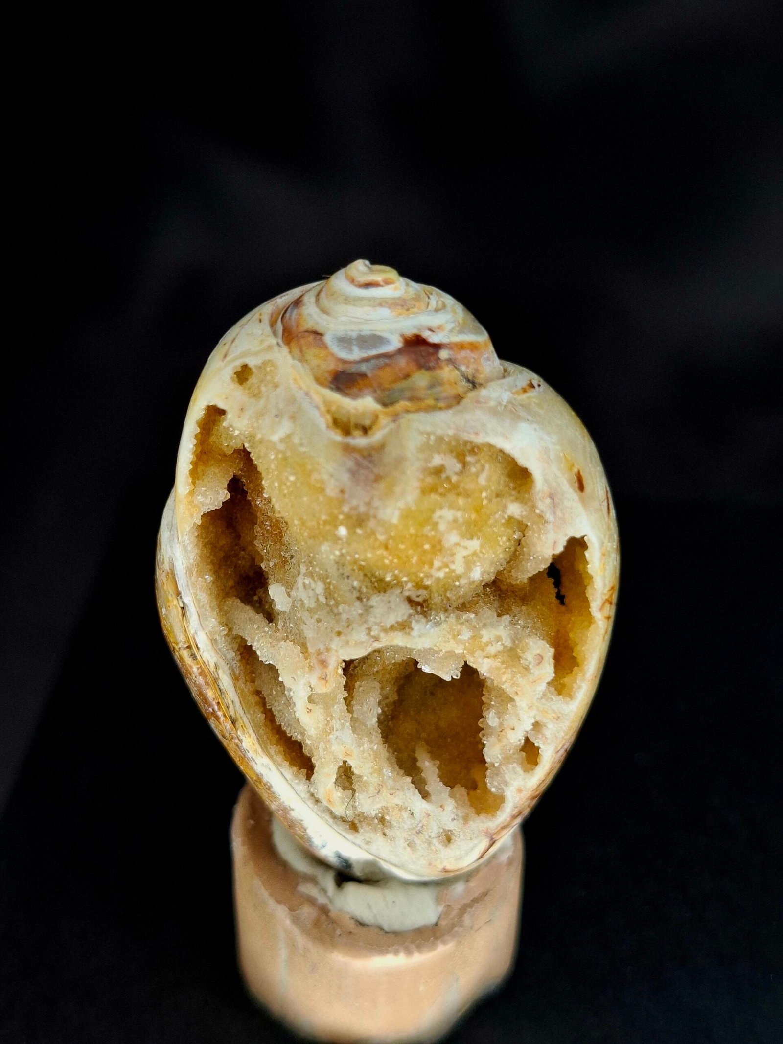 The shell has undergone a remarkable fossilization process known as Agatization. Over millions of years, the original shell material was replaced by microcrystalline quartz or agate, transforming the fossil into a natural geode. The exterior of the shell displays rich, warm brown and orange tones. A natural break reveals a stunning interior, which is lined with sparkling crystals that exhibit a subtle white and purplish-blue hue.