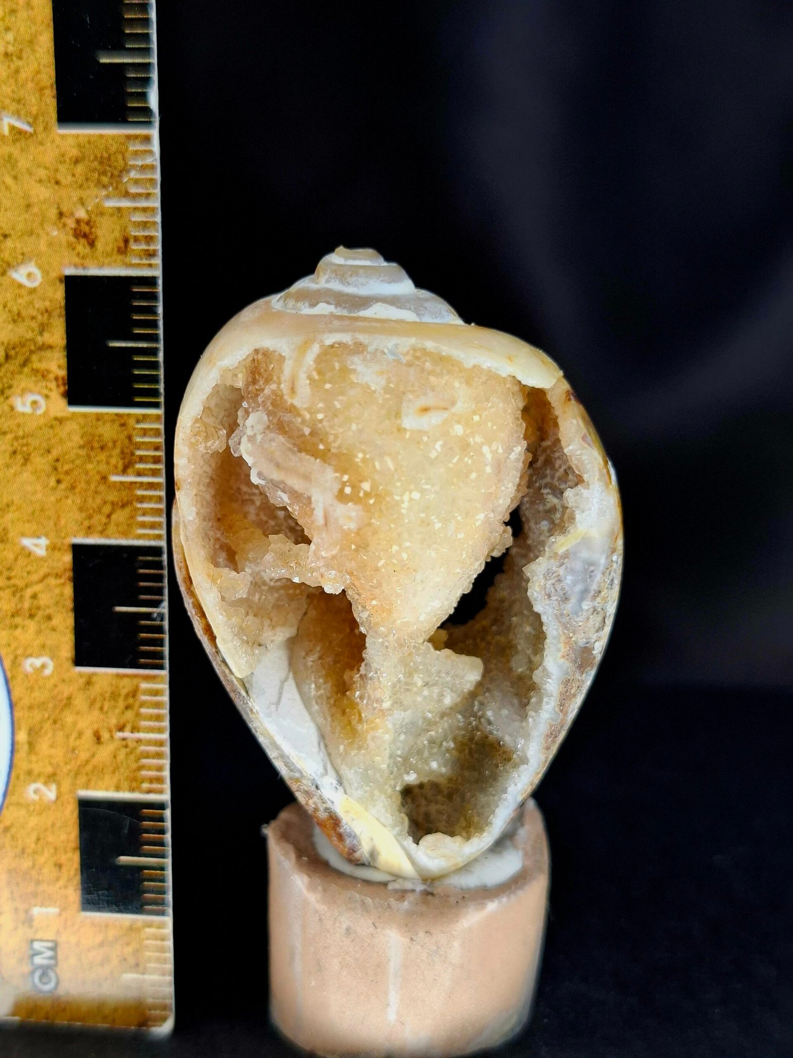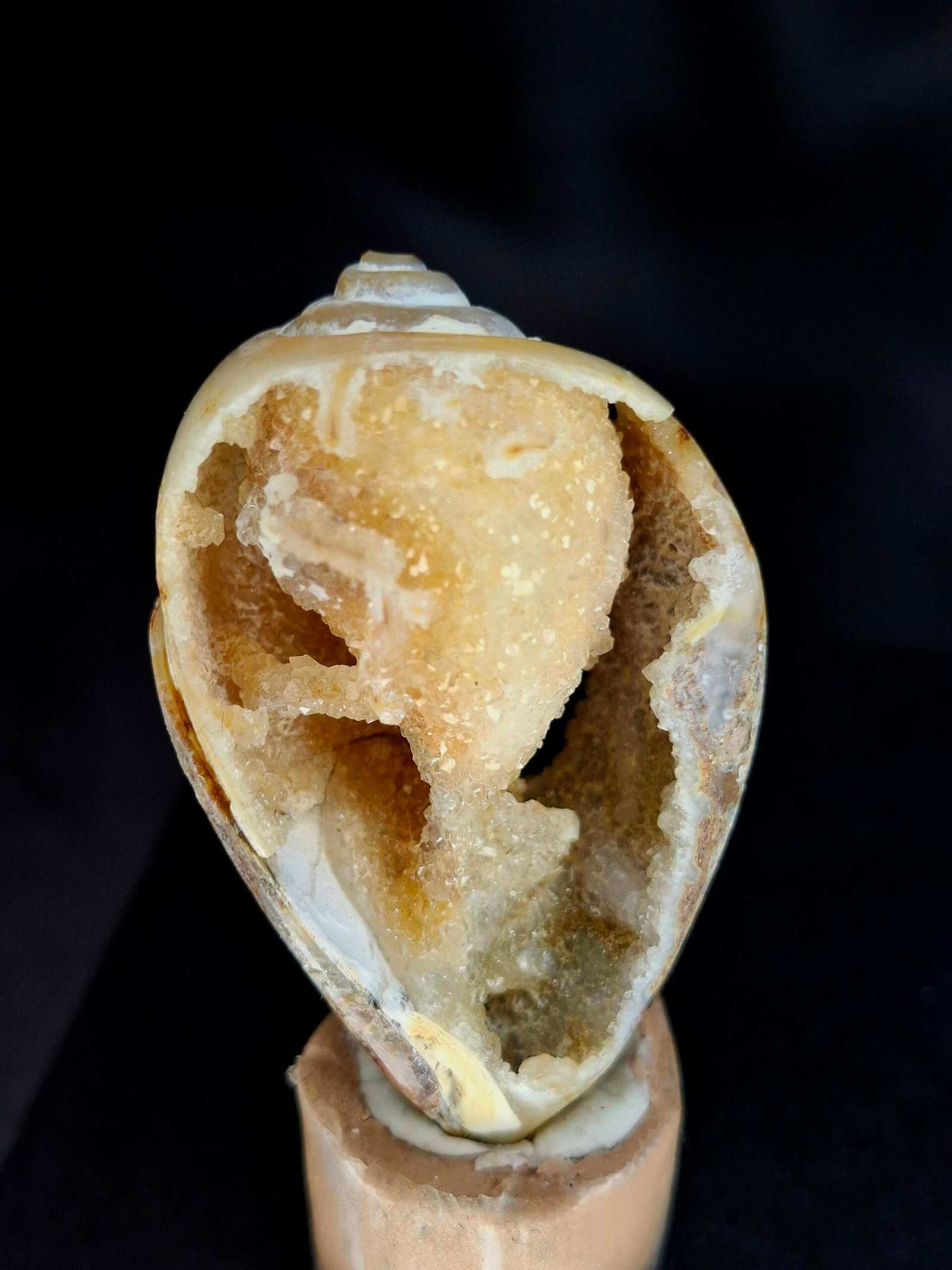 The shell has undergone a remarkable fossilization process known as Agatization. Over millions of years, the original shell material was replaced by microcrystalline quartz or agate, transforming the fossil into a natural geode. The exterior of the shell displays rich, warm brown and orange tones. A natural break reveals a stunning interior, which is lined with sparkling crystals that exhibit a subtle white and purplish-blue hue.