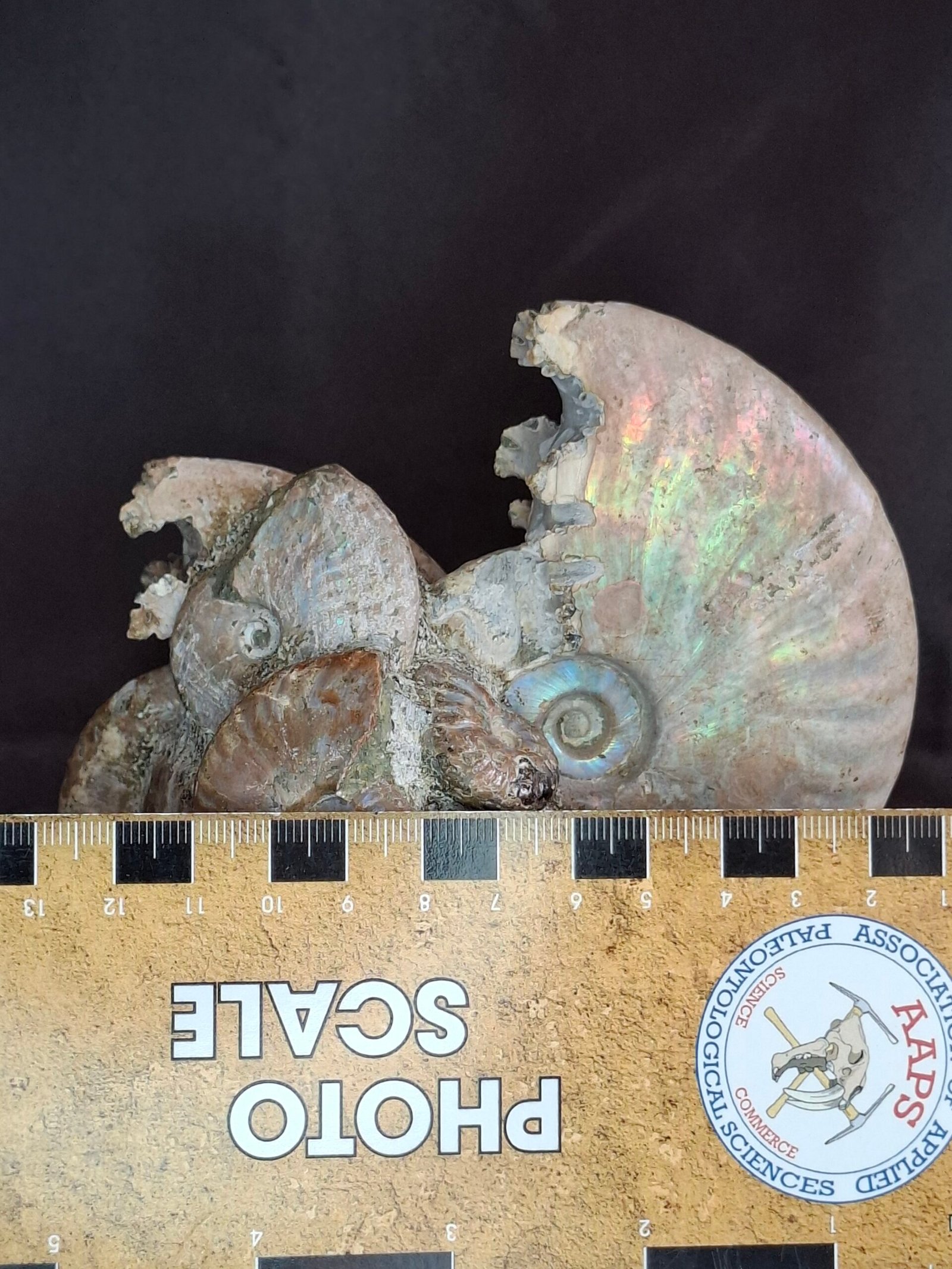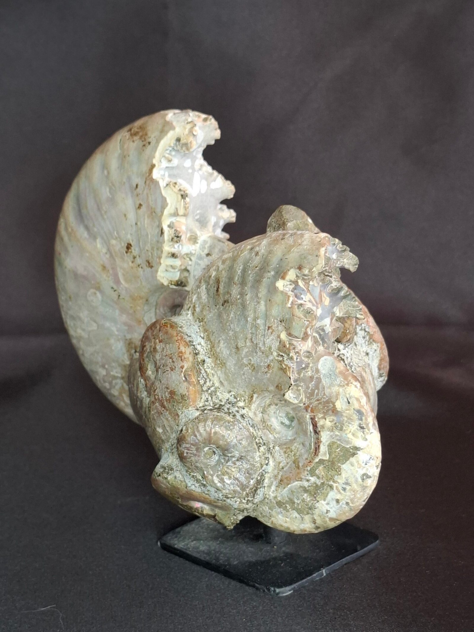 Measuring approximately 11.8 cm in diameter, this piece is not just a beautiful display but an educational one. The true wonder of this specimen lies in its exposed core, which is home to multiple ammonites. You can see the delicate, spiraling chambers and the complex, wavy lines of the septa, the internal walls that once divided the animal’s living space from its buoyancy chambers.