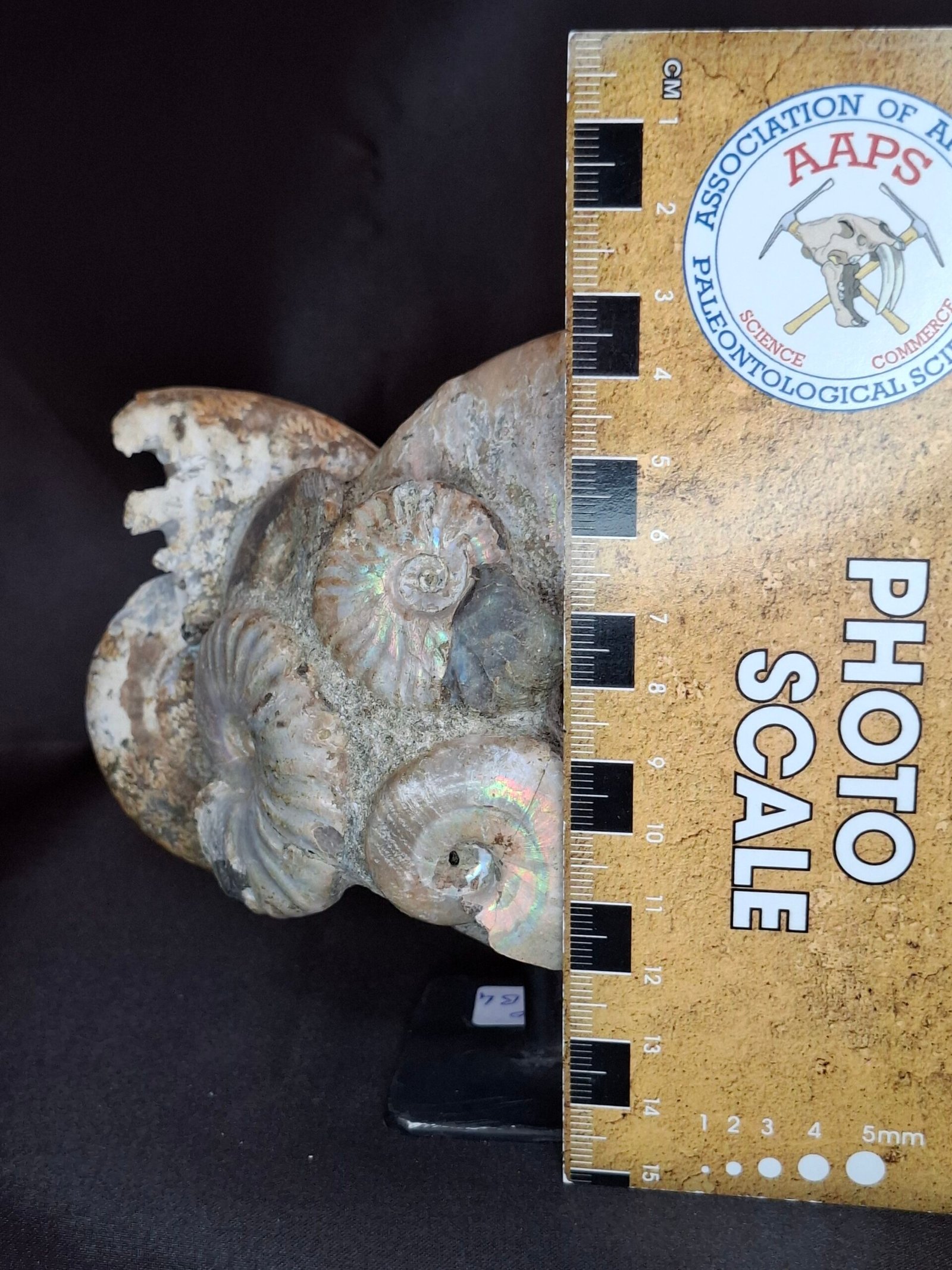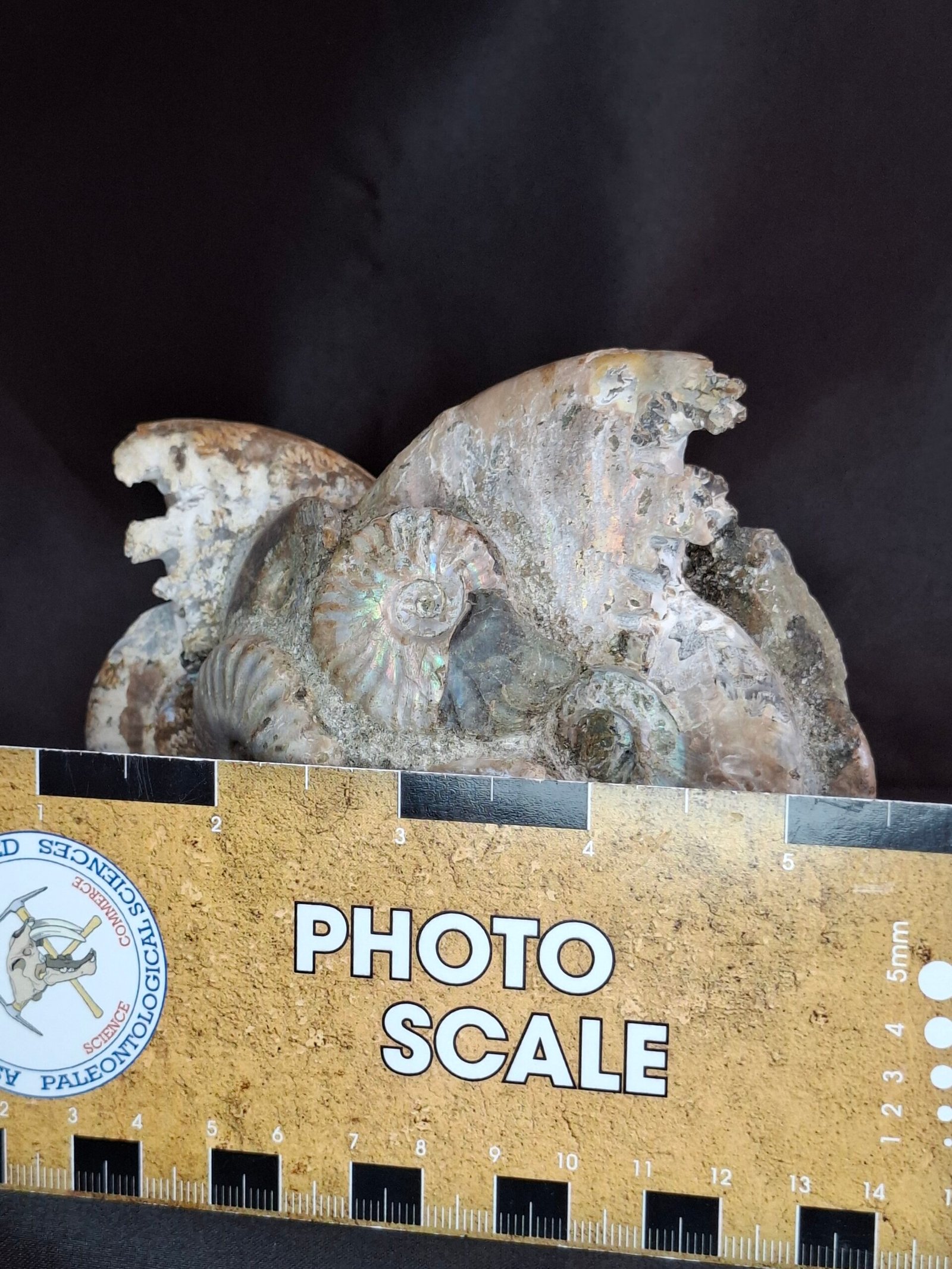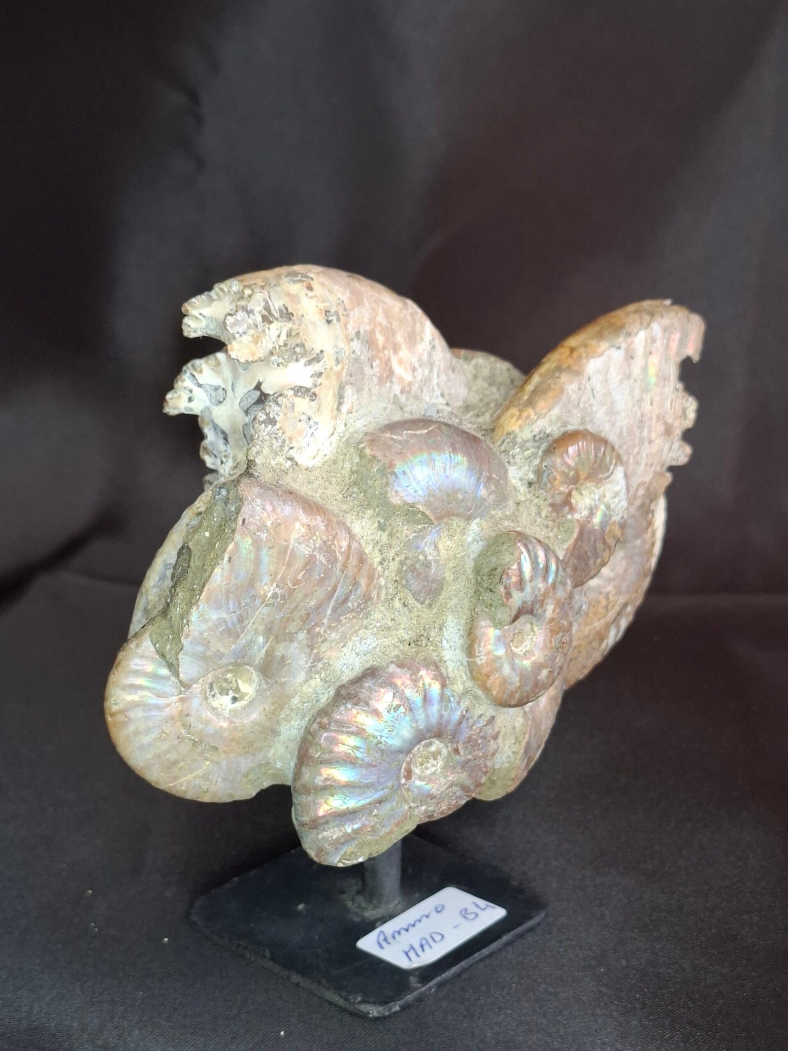 Sourced from the ancient marine beds of Madagascar, this piece stands out by offering a rare glimpse into the fossil’s internal structure. Unlike many external-facing fossils, this specimen has been expertly split to reveal a breathtaking world within. The internal chambers are filled with a stunning, gem-like iridescence, shimmering with deep reds, greens, and golds. This captivating effect is caused by a thin layer of nacre (mother of pearl) that was preserved and mineralized into aragonite over millions of years, creating the “ammolite” phenomenon.
