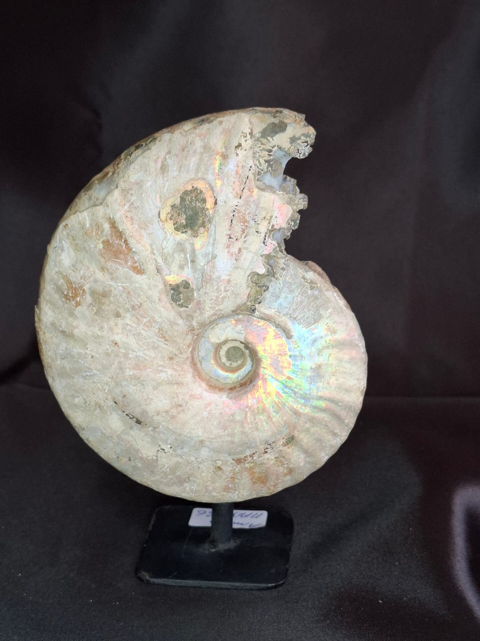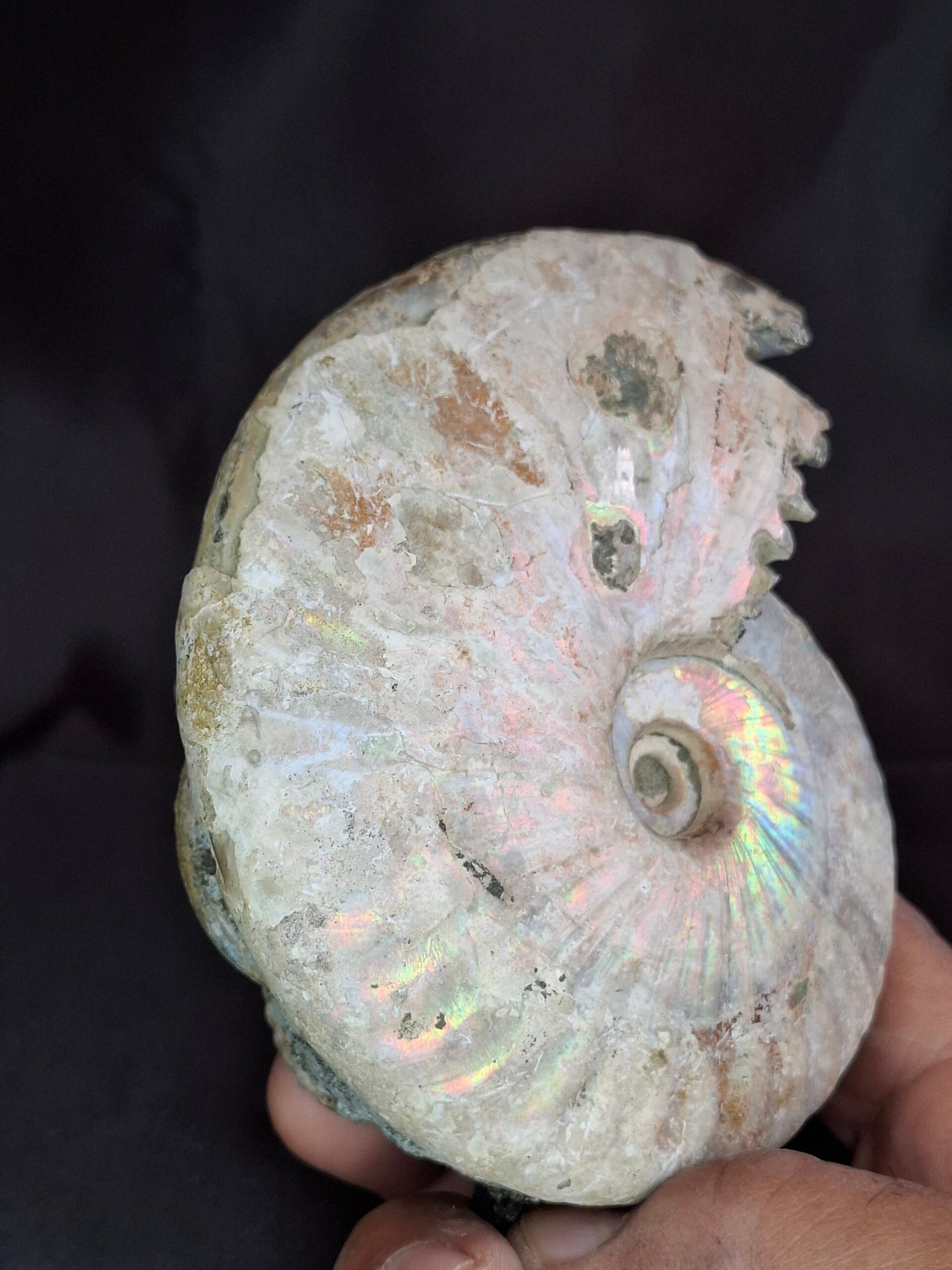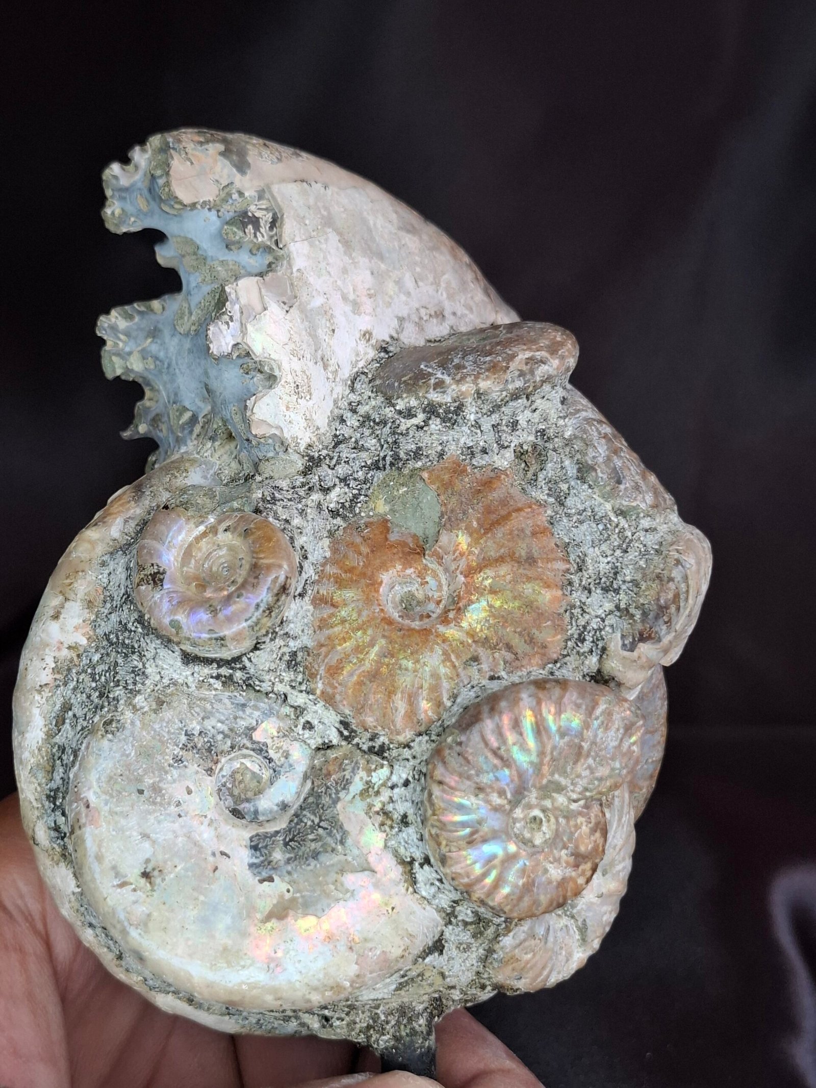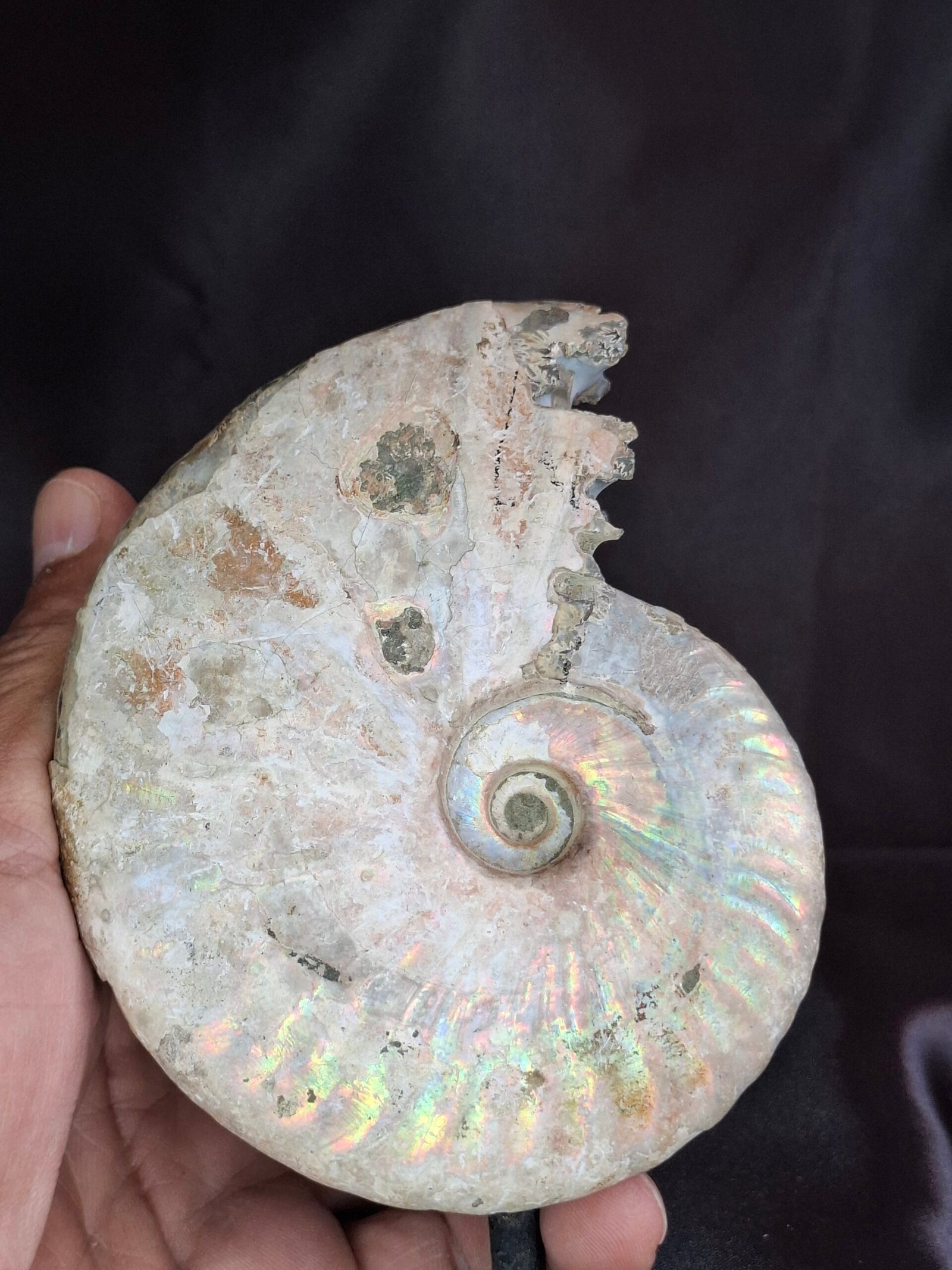 The fossil showcases a beautiful, subtle iridescent sheen that shimmers with a mix of blues, greens, and pinks. On closer inspection, you can see where the original shell has fractured, revealing a peek into the internal structure of the ammonite. This piece also features a smaller, perfectly formed Cleoniceras ammonite nestled at its side, which adds to its unique composition. The detailed, intricate patterns of the suture lines are visible on the fossil’s surface, a testament to the complex biology of these ancient cephalopods.