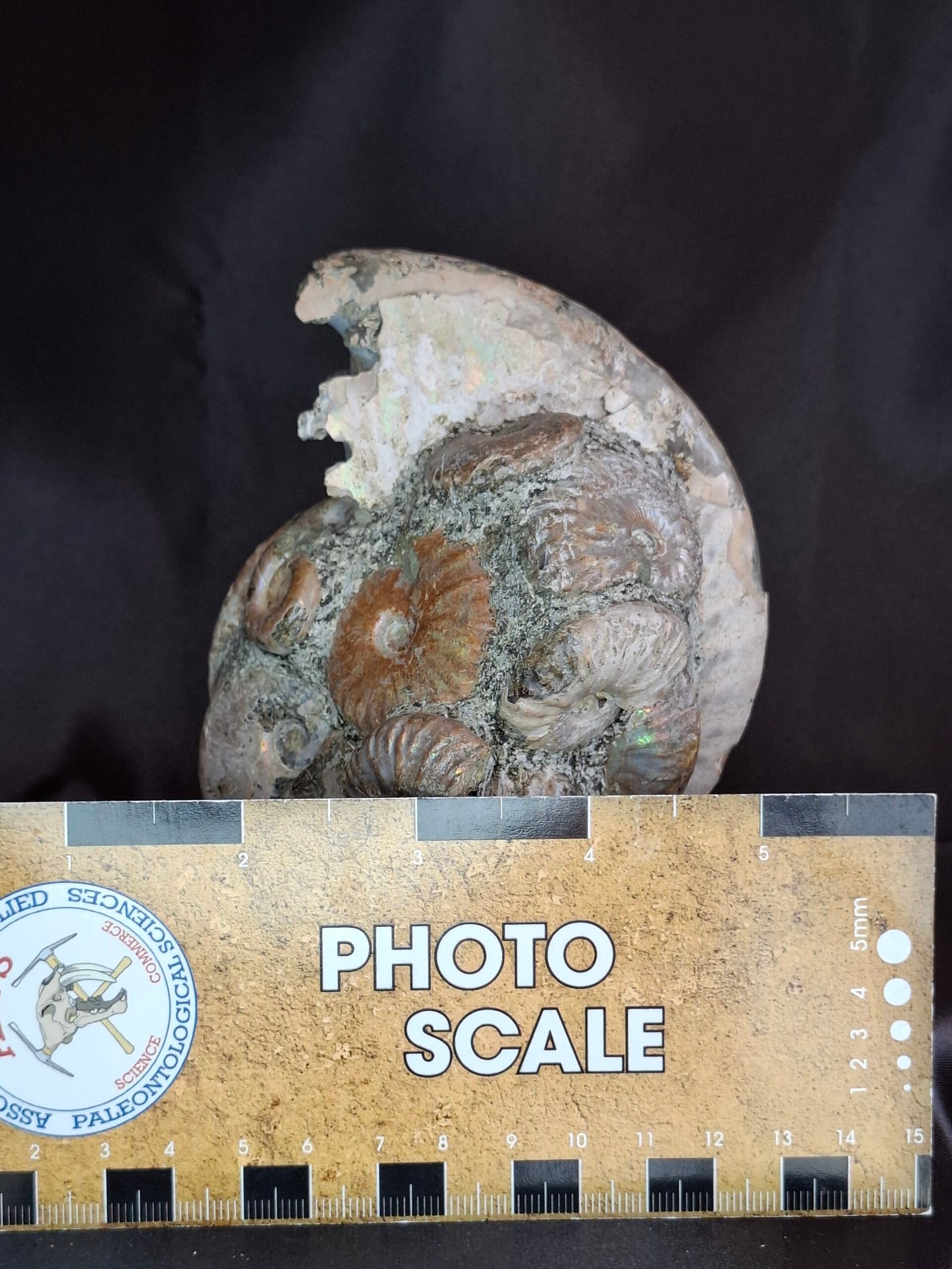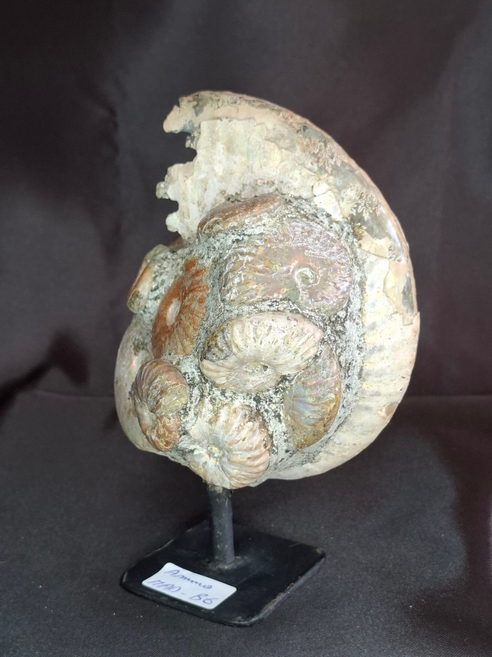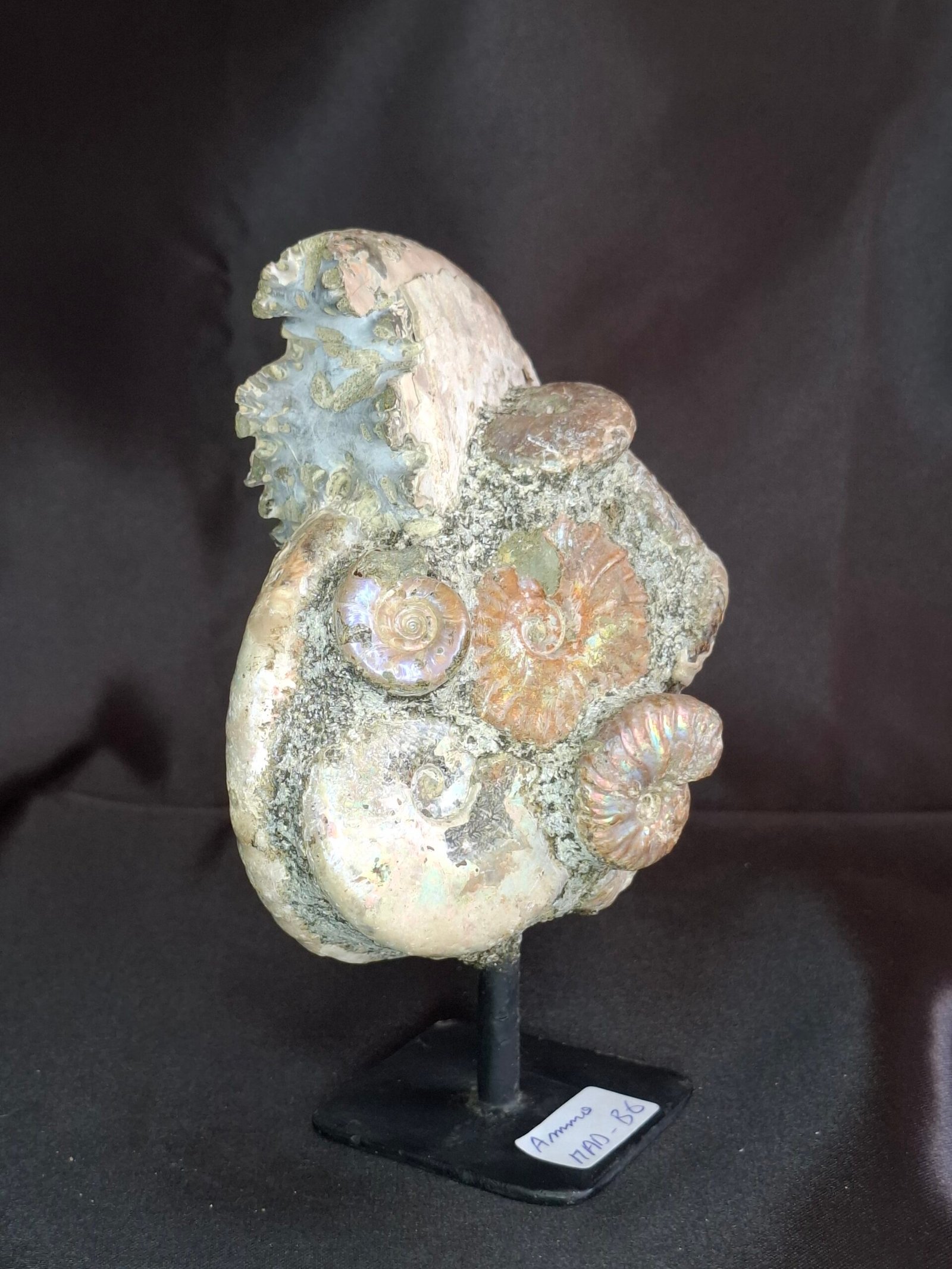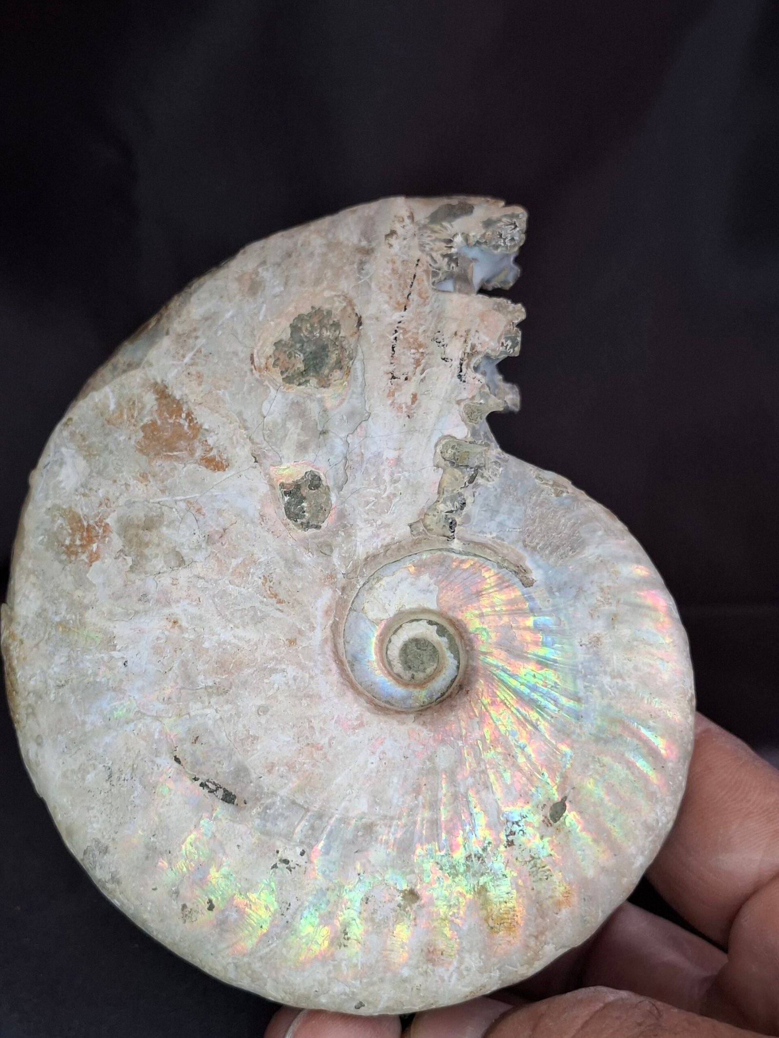 The fossil showcases a beautiful, subtle iridescent sheen that shimmers with a mix of blues, greens, and pinks. On closer inspection, you can see where the original shell has fractured, revealing a peek into the internal structure of the ammonite. This piece also features a smaller, perfectly formed Cleoniceras ammonite nestled at its side, which adds to its unique composition. The detailed, intricate patterns of the suture lines are visible on the fossil’s surface, a testament to the complex biology of these ancient cephalopods.