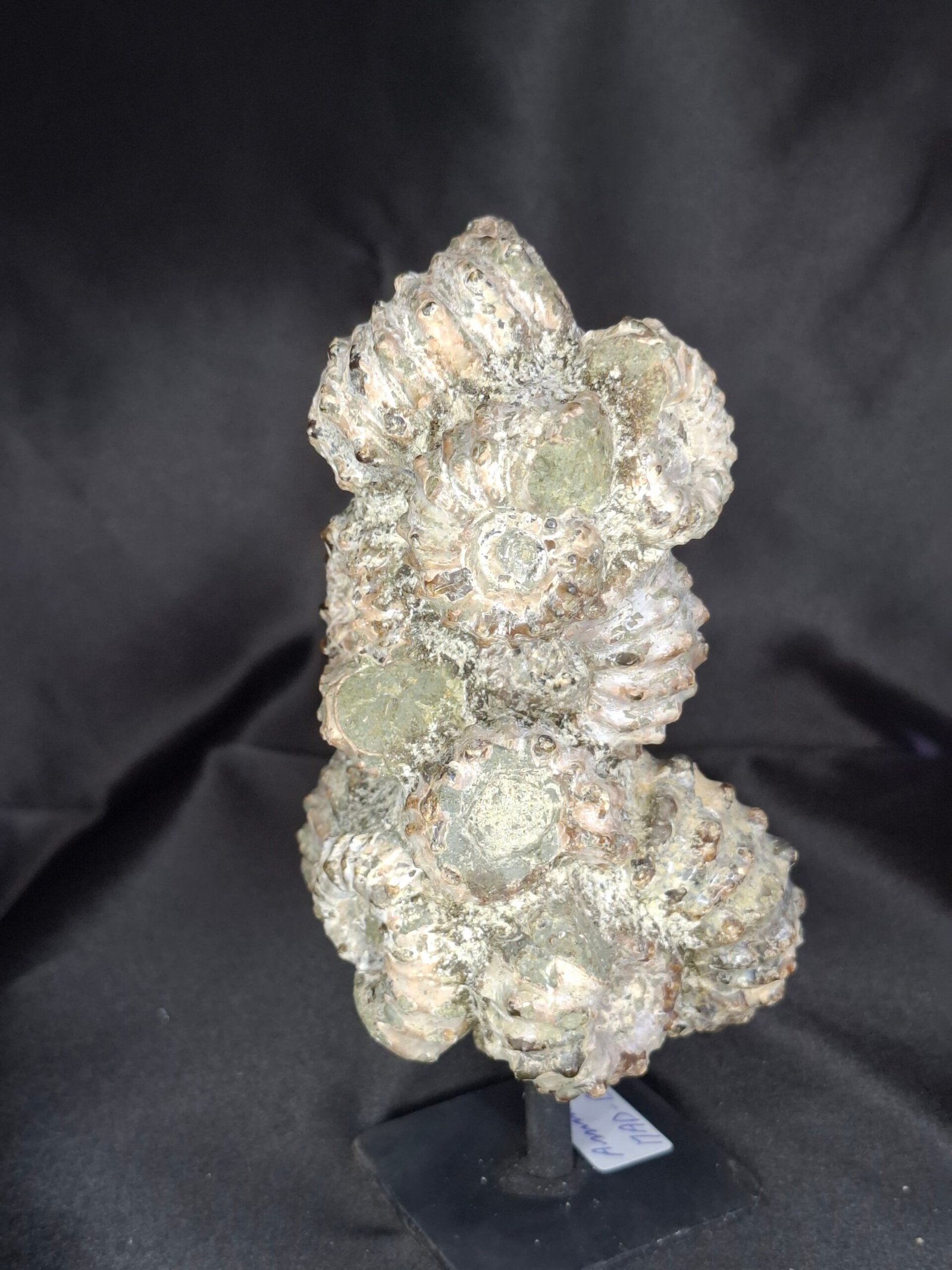 This is a natural cluster, featuring several ammonites of varying sizes embedded together in a single, distinctively shaped rock matrix. The ammonites themselves are characterized by their signature bumpy and heavily ribbed shell texture, which sets them apart from the smooth, iridescent species.