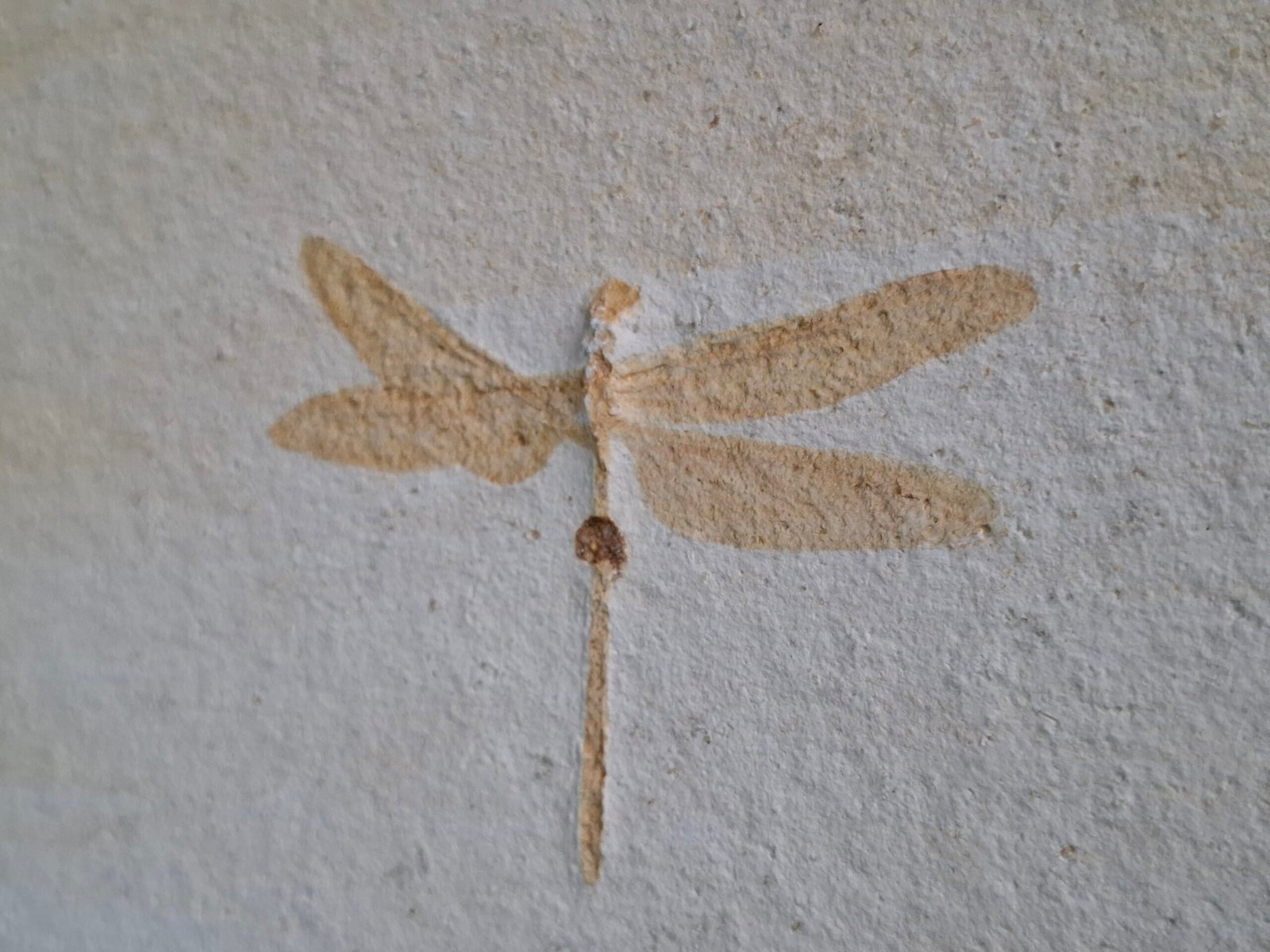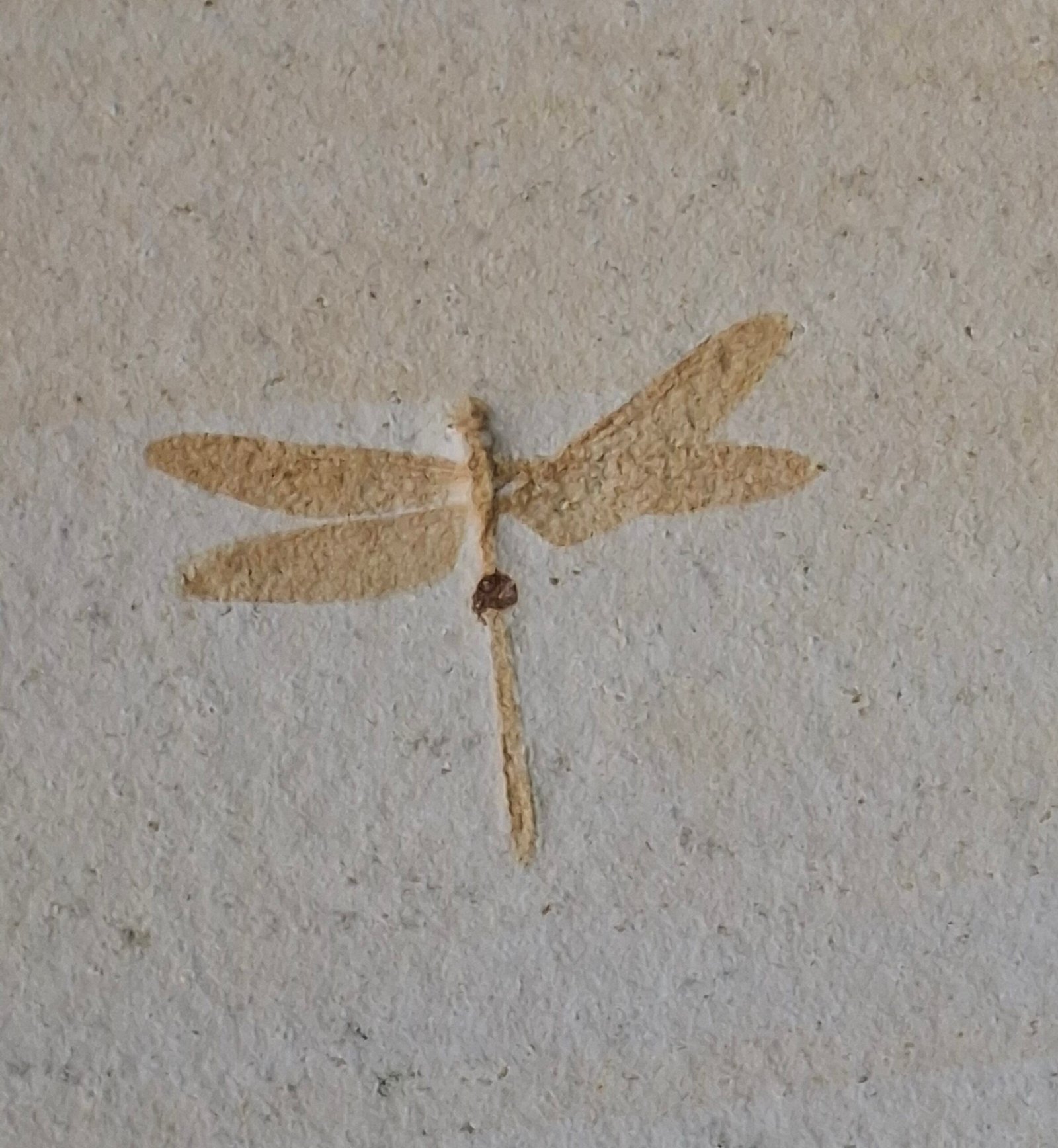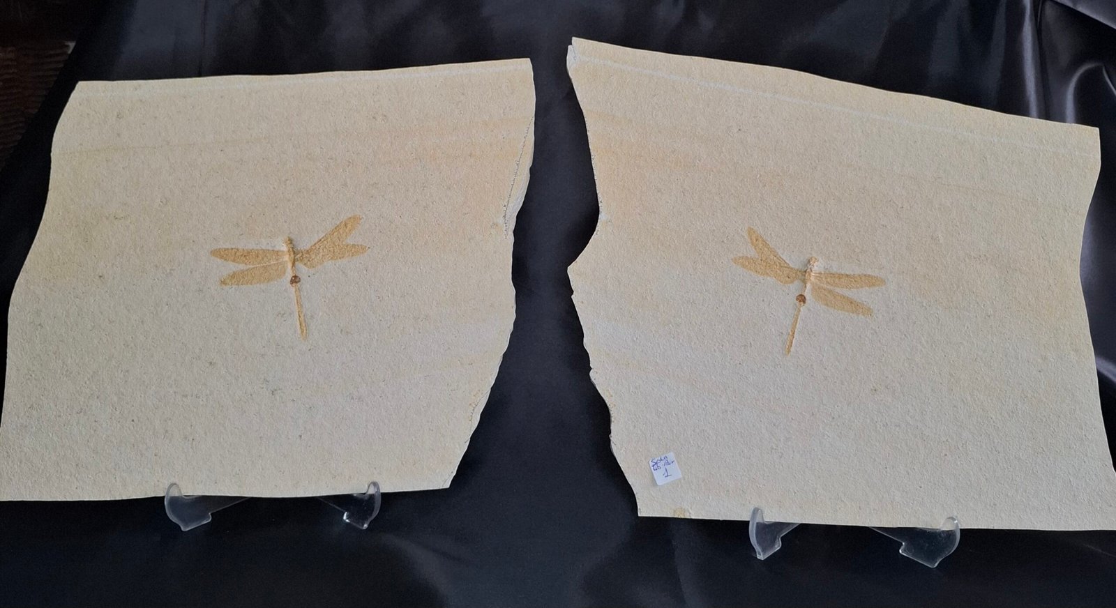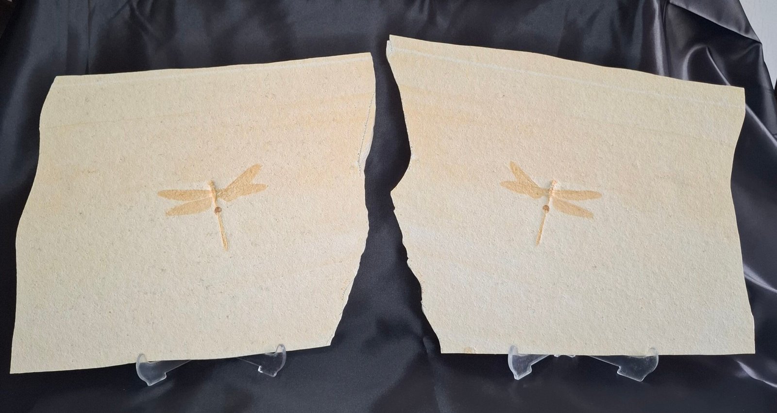 A beautifully preserved dragonfly fossil from the Jurassic-period limestone of Solnhofen, Germany. This rare specimen is presented as a complete pair (positive and negative imprint), showcasing delicate wing venation and body structure. A true collector’s piece from a world-famous fossil site.