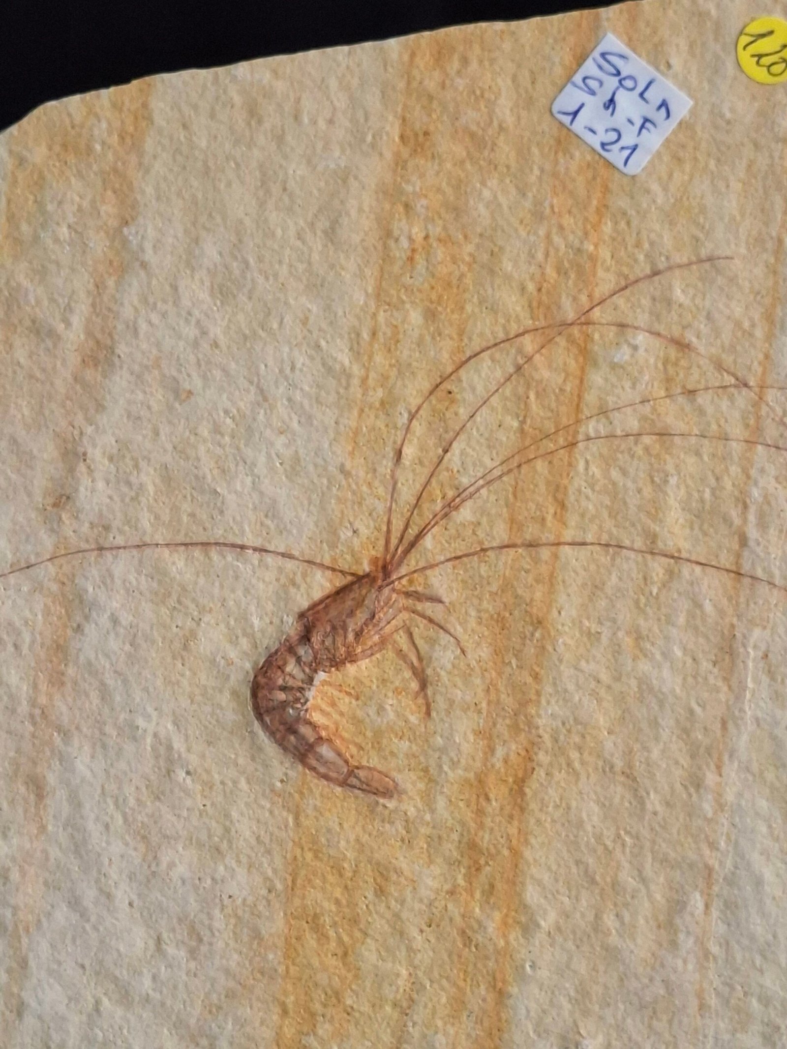 The Solnhofen limestone is a special type of fossil deposit known as a Lagerstätte. It formed in a shallow, quiet, tropical lagoon with very little oxygen. This unique environment prevented decay and allowed for the preservation of incredibly delicate organisms, including the fine details of the shrimp’s body and its antennae. The antennae on this specific piece have been professionally restored, a common practice for such fragile fossils.